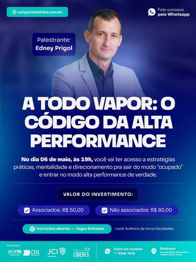 A ACIP/CDL, em parceria com a JCI Pinhalzinho, irá realizar um treinamento exclusivo voltado ao desenvolvimento de lideranças e eficiência profissional. O workshop A Todo Vapor acontece no dia 06 de maio, às 19h, no auditório da Horus Faculdades, trazendo ferramentas para quem busca otimizar resultados no ambiente corporativo e na vida pessoal.