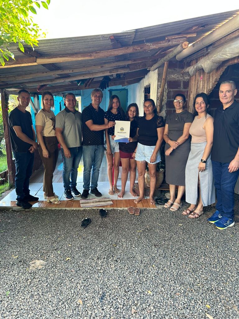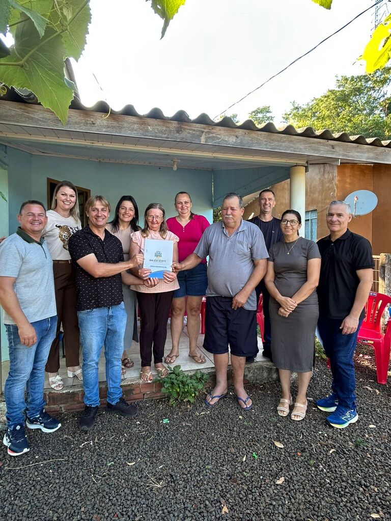 A solenidade de entrega contou com a presença do prefeito Márcio José Storck, do vice-prefeito Leandro Breda e sua esposa, da presidente da Câmara de Vereadores, Vanieli Dall Agnol, e dos vereadores Leonir Simonetti e Elenir Schmitt, evidenciando a parceria entre os poderes Executivo e Legislativo na execução de ações voltadas à regularização fundiária.
