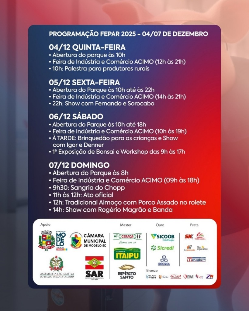A 22ª edição da Festa Estadual do Porco no Rolete (Fepar 2025), em Modelo (SC), está com a programação completa definida e promete movimentar a região entre os dias 4 e 7 de dezembro. O evento vai além do show nacional e oferece uma combinação de gastronomia, negócios e lazer para toda a família.