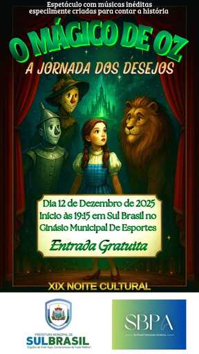 O prefeito Vanderlei Gallina destaca a importância do evento e convida toda a população para prestigiar: “A Noite Cultural já é uma tradição em Sul Brasil, e este ano a apresentação do Mágico de Oz vai trazer ainda mais emoção e encantamento. Convido todas as famílias a participarem conosco deste momento especial, preparado com muito carinho para nossa comunidade. Será uma noite inesquecível.”