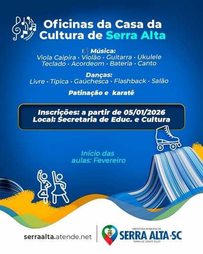 O Departamento de Cultura, em parceria com a Casa da Cultura de Serra Alta, anunciou a abertura das inscrições para as oficinas culturais que terão início em fevereiro de 2026. A iniciativa tem como objetivo incentivar a participação da comunidade, promover a valorização cultural e oferecer oportunidades de aprendizado artístico e esportivo para pessoas de diferentes idades.