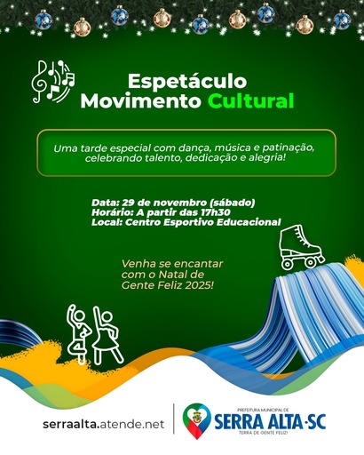 O Governo Municipal de Serra Alta, por meio da Secretaria de Educação e Cultura, promove no sábado, dia 29 de novembro, a partir das 17h30, no Centro Esportivo Educacional, o Espetáculo Movimento Cultural. A programação reunirá apresentações de dança, música e patinação, oferecendo ao público uma mostra do trabalho desenvolvido ao longo do ano nas oficinas culturais do município.